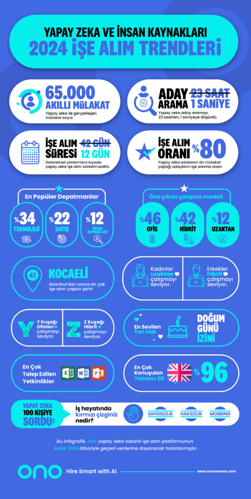 Yapay zekânın iş hayatının tüm alanlarına hızla etki etmeye başlamışken 2021’de kurulan yapay zekâ tabanlı işe alım platformu Onenewone Ono bu yıl bir infografikle işe alımın trendlerini paylaştı.