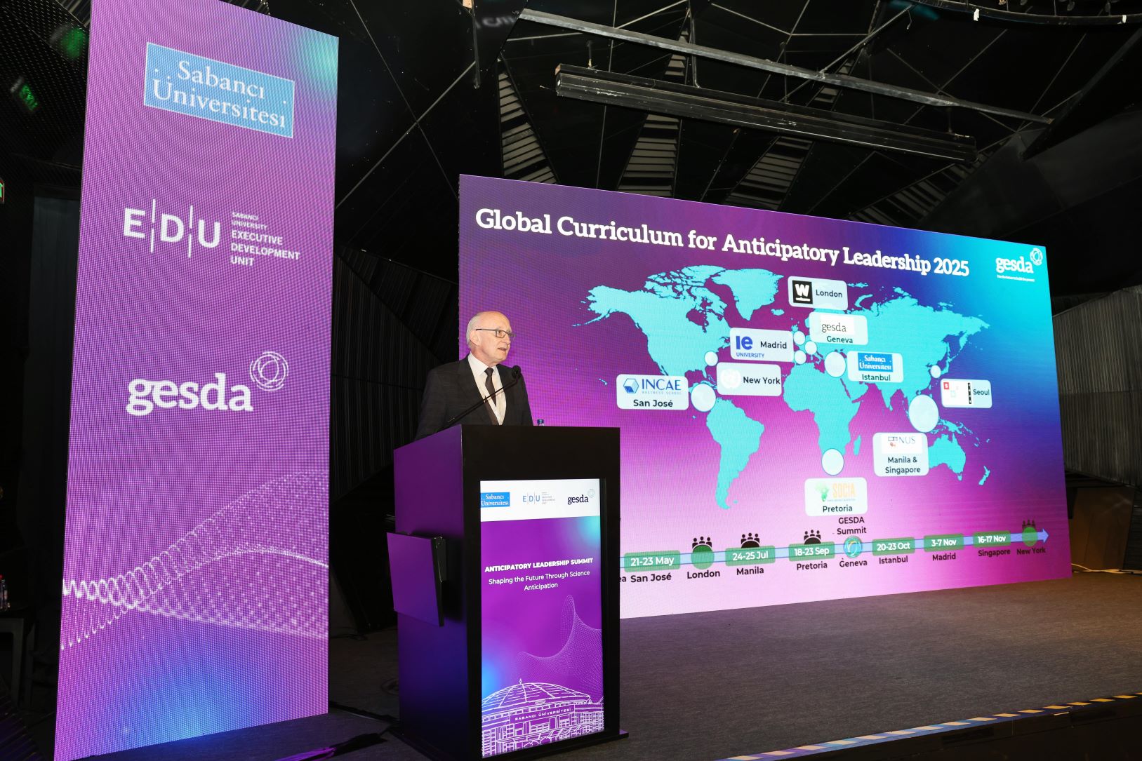İsviçre Federal Hükümeti ve Cenevre Kantonu tarafından kurulan, Wellcome tarafından desteklenen GESDA; öngörücü bilim, diplomasi ve küresel iş birliğini teşvik eden dünyanın en yenilikçi platformlarından biri olarak kabul ediliyor. Misyonu, toplumları bilim ve teknolojiyle dönüşen bir geleceğe hazırlamak olan GESDA, birinci sınıf üniversiteleri, işletme okullarını, uluslararası kuruluşları ve diplomatik liderleri bir araya getirerek; farklı sektörlerden karar vericilerin geleceğin bilimsel atılımlarını öngörmesini ve bu öngörülerle stratejik, kararlı adımlar atabilmesini hedefliyor. Sabancı Üniversitesi, 11 Ekim 2024’te GESDA Zirvesi kapsamında lansmanı yapılan Öngörülü Liderlik Eğitimi için Küresel Müfredat (GCAL) girişimi için beş resmi pilot merkezden biri olarak seçildi.Program, dünya çapındaki liderleri bilim ve teknolojinin şekillendirdiği hızlı dönüşümlere hazırlama yolunda önemli bir adım olarak kabul ediliyor.