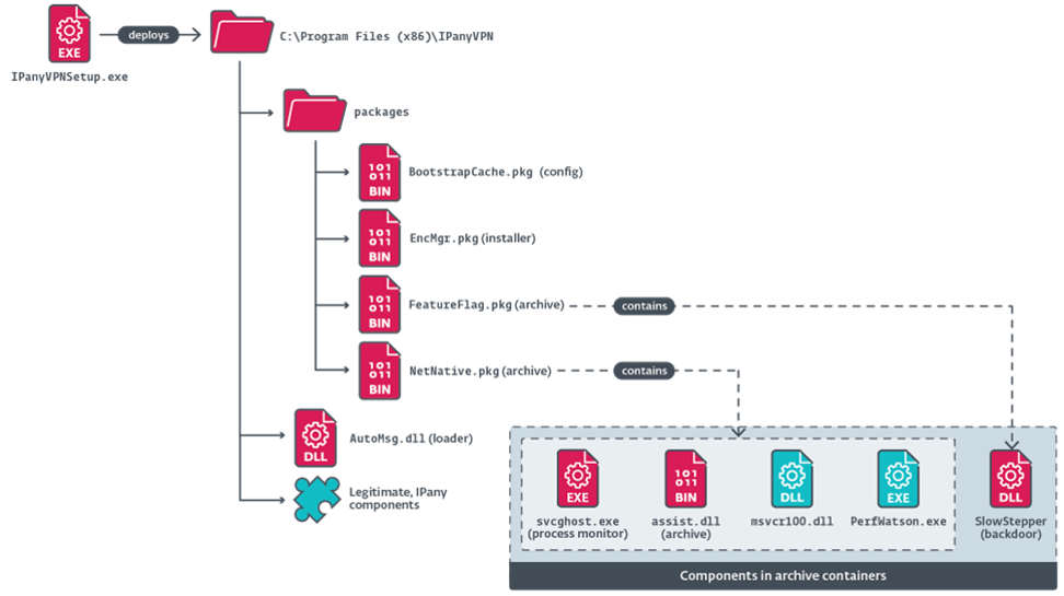 Bu siber casusluk operasyonunda saldırganlar, yasal yükleyiciyi, ESET’in SlowStepper adını verdiği ve 30’dan fazla bileşenden oluşan bir araç setine ve zengin özelliklere sahip bir arka kapı olan grubun imza implantını da dağıtan bir yükleyiciyle değiştirdiler. Çin’e bağlı tehdit aktörü en az 2019’dan beri aktif. Çin, Tayvan, Hong Kong, Güney Kore, Amerika Birleşik Devletleri ve Yeni Zelanda’daki kişi ve kuruluşlara karşı casusluk operasyonları yürütüyor.