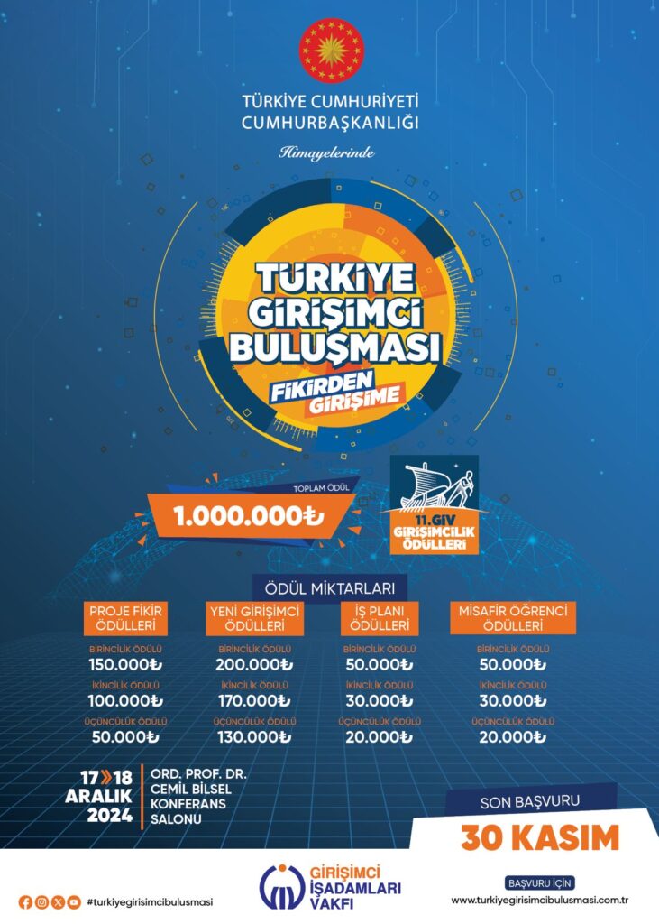 11. GİV Girişimcilik Ödülleri ise 18 Aralık (2024 )akşamında sahiplerini bulacak. Proje Fikir Ödülleri, İş Planı Ödülleri, Kurumsal Girişimcilik Ödülü, Yeni Girişimcilik Ödülü, Üniversite Girişimcilik Kulüp Ödülü, Dijital Ekonomi Ödülü, Basın Yayın Medya Ödülü, Akademisyen Ödülü, Kamu Yöneticisi Ödülü ve GİV Özel Ödülü olmak üzere toplam 10 kategoride 14 ödül verilecek. Henüz ticarileşmemiş “Proje Fikir Ödülleri” kategorisinde ödül miktarı toplam 1.000.000 TL olacak.